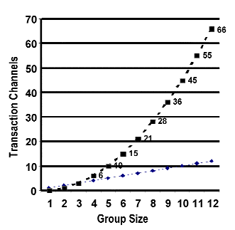 The geometric progression continues as team size increases. Figure 3 shows how quickly transaction channels increase with additional people. Each channel can be thought of as an overhead burden imposed by team size.